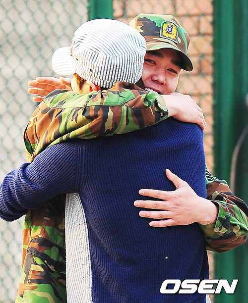 16일 오전 경기도 남양주 56사단에서 군 제대한 그룹 슈퍼주니어의 멤버 강인이 부대 앞에서 마중나온 슈퍼주니어의 이특과 뜨거운 포옹을 나누고 있다.