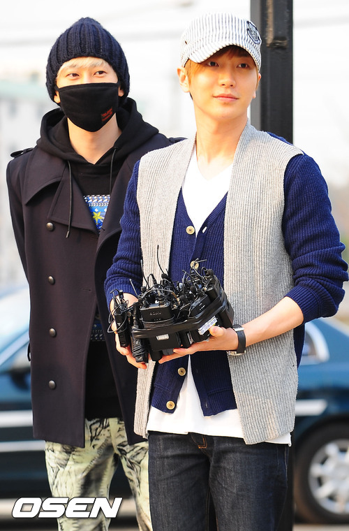 16일 오전 경기도 남양주 56사단에서 군 제대한 그룹 슈퍼주니어의 멤버 강인이 부대 앞에서 팬들과 인사를 나눌때 은혁과 이특이 마이크 묶음을 들고 인터뷰 준비하고 있다.
