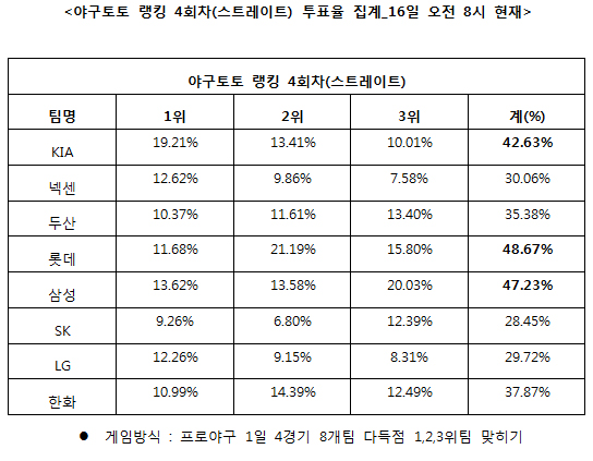 2012 프로야구 대상 야구토토 랭킹 4회차 투표율 중간집계 결과