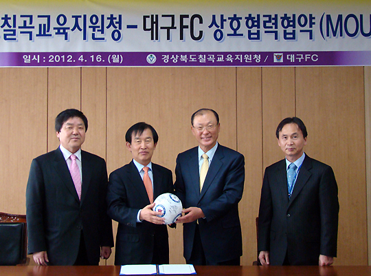 대구FC와 경상북도칠곡교육지원청이 16일 오전 10시 칠곡교육지원청에서 MOU를 맺고 지역 청소년들을 위한 재능 기부에 힘쓴다.
