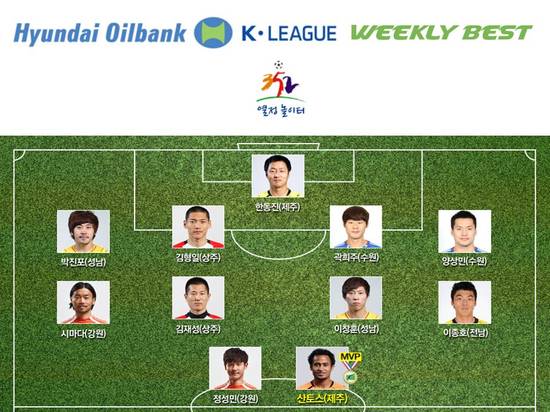 베스트 11은 4-4-2 포메이션으로 선정됐다. 공격수 투톱에는 산토스와 함께 1골을 기록한 강원의 정성민이 뽑혔다. 연맹은 "저돌적인 플레이와 빠른 판단이 돋보였던 김은중의 새 파트너다"고 설명했다.