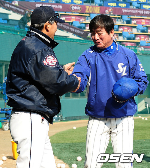 17일 오후 서울 잠실구장에서 열린 '2012 팔도 프로야구' 두산 베어스와 삼성 라이온즈의 경기에 앞서 두산 김진욱 감독과 삼성 류중일 감독이 인사를 나누고 있다.