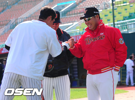 17일 오후 부산 사직구장에서 열리는 '2012 팔도 프로야구' 롯데 자이언츠와 SK 와이번스의 경기 전 SK 이만수 감독와 롯데 황재균이 인사를 나누고 있다.