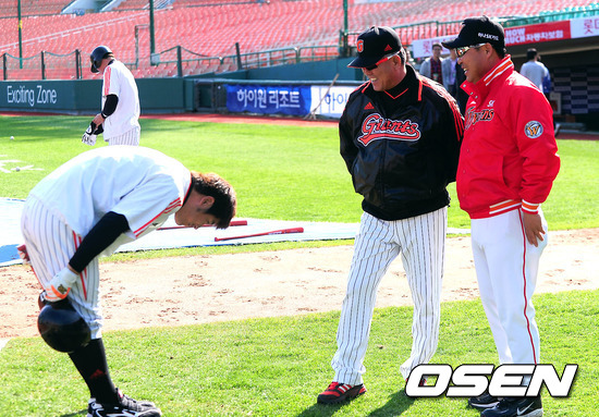 17일 오후 부산 사직구장에서 열리는 '2012 팔도 프로야구' 롯데 자이언츠와 SK 와이번스의 경기 전 롯데 강민호가 SK 이만수 감독과 롯데 양승호 감독에게 인사를 하고 있다