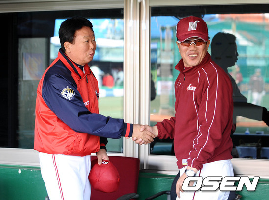 17일 오후 서울 목동야구장에서 열린 '2012 팔도 프로야구' 넥센 히어로즈와 KIA 타이거즈의 경기, 경기 전 KIA 선동렬 감독과 넥센 김시진 감독이 악수를 나누고 있다.
