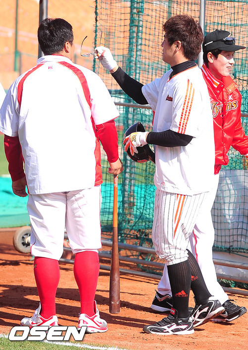 17일 오후 부산 사직구장에서 열리는 '2012 팔도 프로야구' 롯데 자이언츠와 SK 와이번스의 경기 전 롯데 강민호가 SK 조인성의 안경을 만지고 있다.