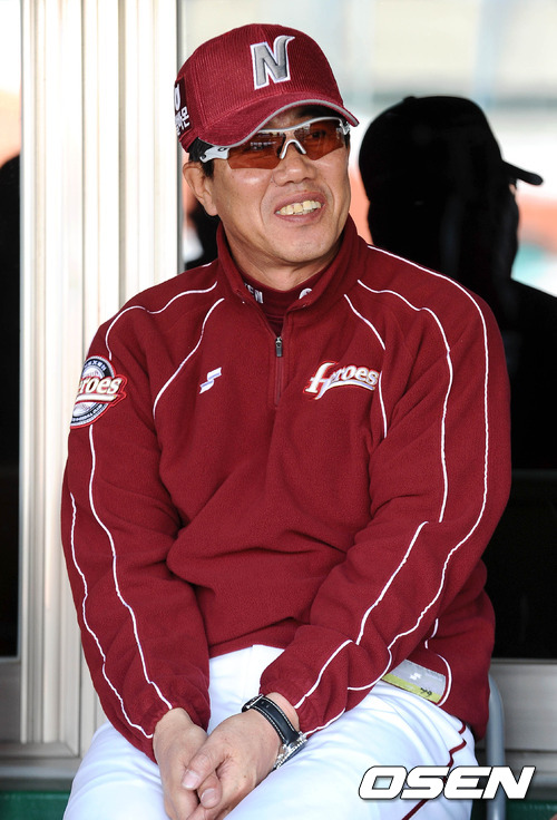 17일 오후 서울 목동야구장에서 열린 '2012 팔도 프로야구' 넥센 히어로즈와 KIA 타이거즈의 경기, 경기 전 넥센 김시진 감독이 취재진과 이야기를 나누고 있다.