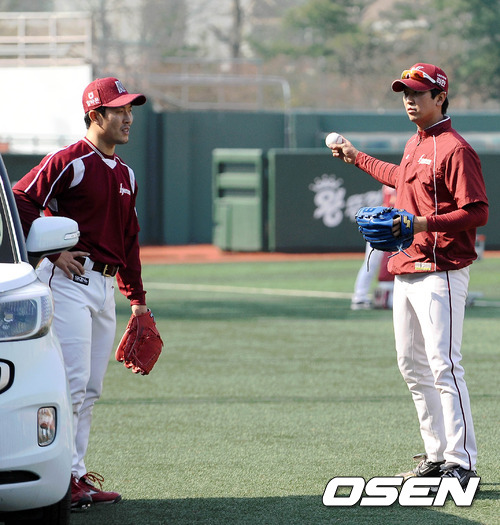 17일 오후 서울 목동야구장에서 열린 '2012 팔도 프로야구' 넥센 히어로즈와 KIA 타이거즈의 경기, 경기 전 넥센 김병현이 심수창과 이야기를 나누고 있다.