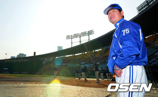 17일 오후 서울 잠실구장에서 열린 '2012 팔도 프로야구' 두산 베어스와 삼성 라이온즈의 경기에 앞서 삼성 류중일 감독이 그라운드에 나와 선수들의 훈련을 지켜보고 있다.