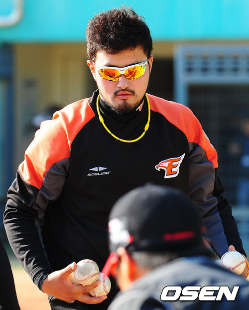 17일 오후 충청북도 청주구장에서 '2012 팔도 프로야구' 한화 이글스와 LG 트윈스의 경기가 열릴 예정인 가운데 양팀 훈련시간에 한화 안승민이 야구공을 치우고 있다.
