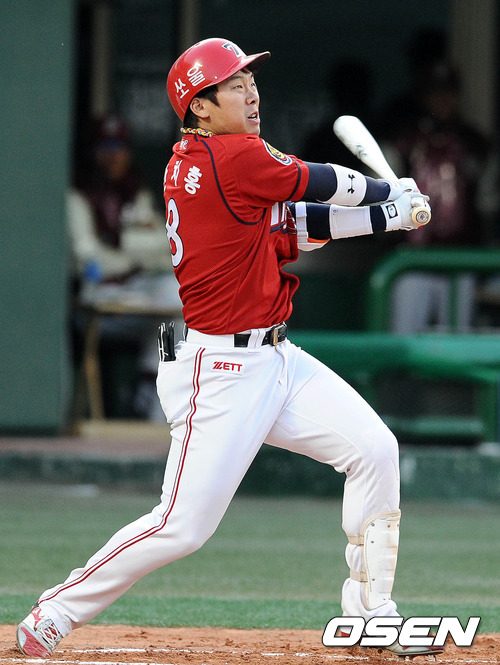 17일 오후 서울 목동야구장에서 열린 '2012 팔도 프로야구' 넥센 히어로즈와 KIA 타이거즈의 경기, 1회초 1사 2루에서 KIA 안치홍이 선제 중전 1타점 적시타를 치고 있다.