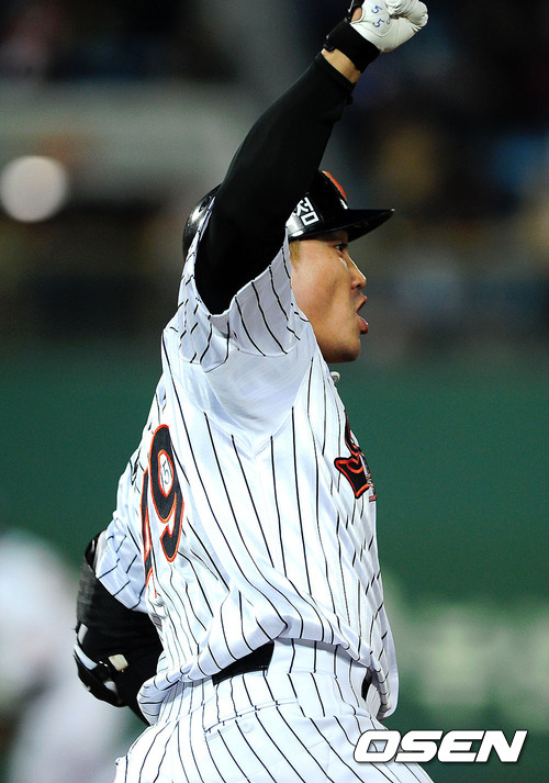 17일 오후 부산 사직구장에서 열린 '2012 팔도 프로야구' 롯데 자이언츠와 SK 와이번스의 경기 4회말 1사 1루 롯데 홍성흔이 동점 2점 홈런을 날리고 환호하고 있다.