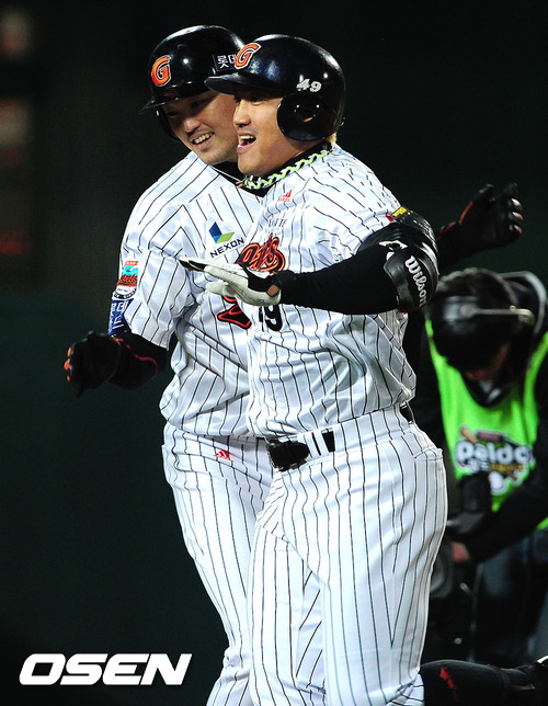 17일 오후 부산 사직구장에서 열린 '2012 팔도 프로야구' 롯데 자이언츠와 SK 와이번스의 경기 4회말 1사 1루 롯데 홍성흔이 동점 2점 홈런을 날리고 베이스를 돌고 있다