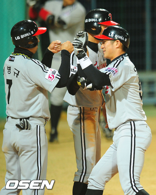 17일 오후 충청북도 청주구장에서 열린 '2012 팔도 프로야구' 한화 이글스와 LG 트윈스의 경기에서 4회초 1사 주자 1,2루 LG 오지환이 좌중월 스리런 홈런을 날린 후 홈에서 이병규와 하이파이브를 하고 있다.