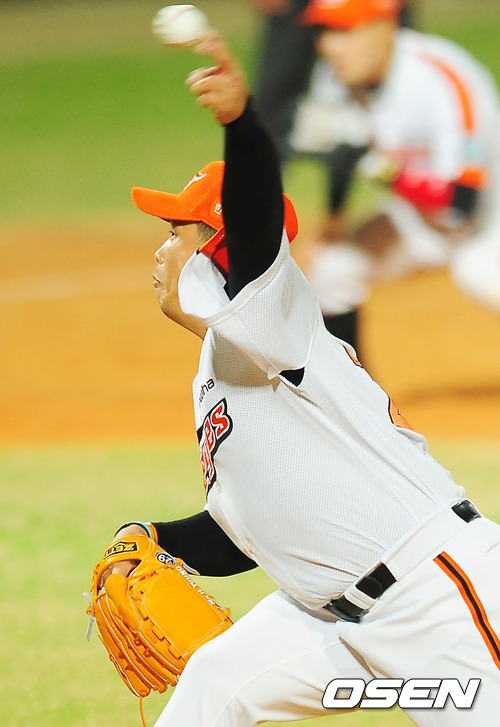 17일 오후 충청북도 청주구장에서 열린 '2012 팔도 프로야구' 한화 이글스와 LG 트윈스의 경기에서 5회초 한화 선발 양훈 대신 마운드에 오른 마일영이 힘차게 공을 뿌리고 있다.