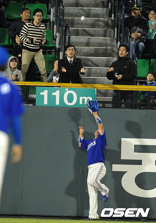 17일 오후 서울 잠실구장에서 열린 '2012 팔도 프로야구' 두산 베어스와 삼성 라이온즈의 경기, 5회말 1사에서 삼성 최형우가 두산 손시헌의 타구를 잡아내고 있다.