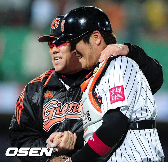 경기종료 후 롯데 양승호 감독과 강민호가 승리의 기쁨을 나누고 있다./soul1014@osen.co.kr