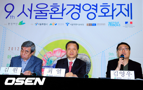 18일 오전 중구 서소문로에서 열린 제 9회 서울 환경 영화제 기자회견에서 김원 조직위원장, 최열 집행위원장, 김영우 프로그래머가 기자회견을 갖고 있다.