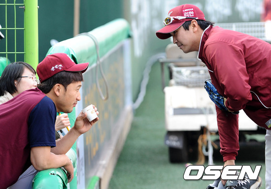 18일 오후 서울 목동야구장에서 열린 '2012 팔도 프로야구' 넥센 히어로즈와 KIA 타이거즈의 경기, 경기 전 넥센 심수창이 이택근과 이야기를 나누고 있다.