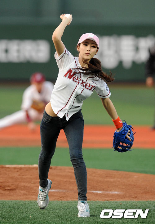 18일 오후 서울 목동야구장에서 열린 '2012 팔도 프로야구' 넥센 히어로즈와 KIA 타이거즈의 경기, 경기 전 브레이브걸스 예진이 시구를 하고 있다.