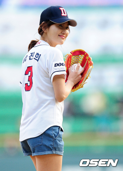18일 오후 서울 잠실구장에서 열린 '2012 팔도 프로야구' 두산 베어스와 삼성 라이온즈의 경기에 앞서 배우 박진희가 시구를 하고 있다. 가수 존박은 시타를 선보였다.