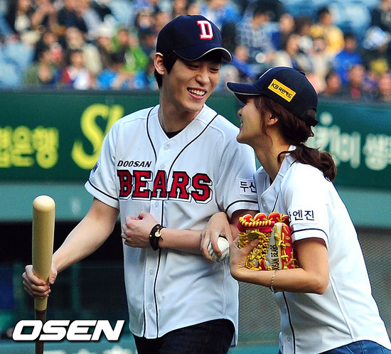 18일 오후 서울 잠실구장에서 열린 '2012 팔도 프로야구' 두산 베어스와 삼성 라이온즈의 경기에 앞서 박진희, 존박이 시구, 시타를 끝내고 퇴장하고 있다.