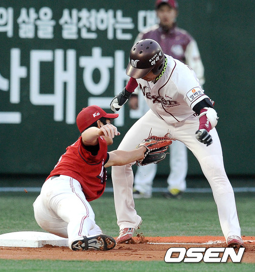 18일 오후 서울 목동야구장에서 열린 '2012 팔도 프로야구' 넥센 히어로즈와 KIA 타이거즈의 경기, 1회말 2사 1,2루 넥센 강정호가 선제 좌전 2타점 적시타를 치고 3루에서 홍재호에게 태그 아웃 당하고 있다.