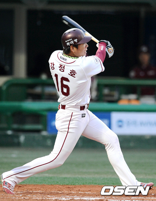 18일 오후 서울 목동야구장에서 열린 '2012 팔도 프로야구' 넥센 히어로즈와 KIA 타이거즈의 경기, 1회말 2사 1,2루 넥센 강정호가 선제 좌전 2타점 적시타를 치고 있다.