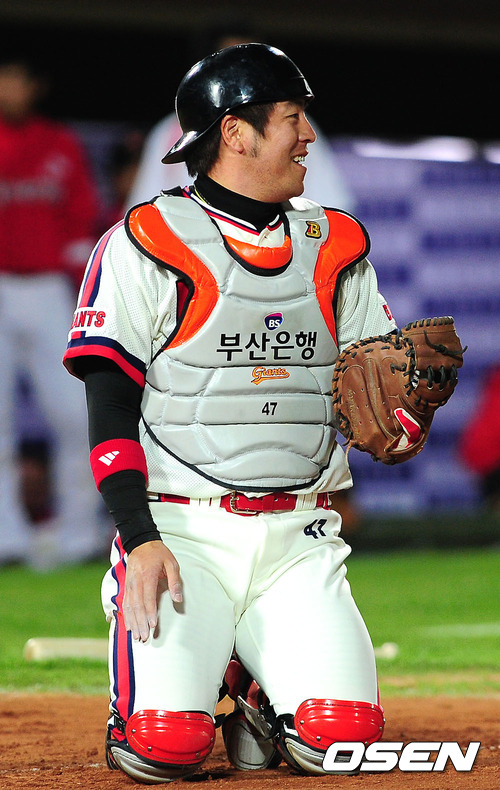 18일 오후 부산 사직구장에서 열린 '2012 팔도 프로야구' 롯데 자이언츠와 SK 와이번스의 경기 4회말 2사 1루 SK 조인성의 2루타때 롯데 강민호 포수가 1루 주자 안치용을 홈에서 태그아웃 시켰다. 강민호가 미소짓고 있다