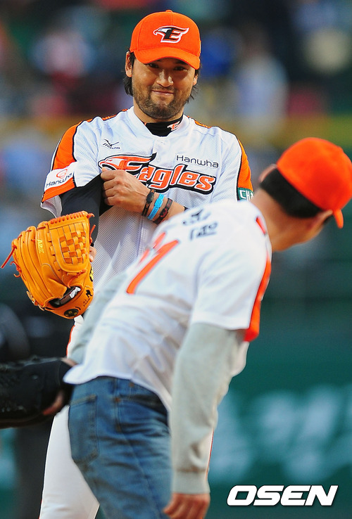 18일 오후 충청북도 청주구장에서 열린 '2012 팔도 프로야구' 한화 이글스와 LG 트윈스의 경기에서 탤런트 박상원이 박찬호 앞에서 시구를 한 후 박찬호가 미소짓고 있다.
