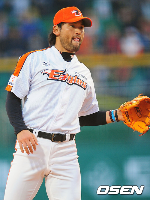 18일 오후 충청북도 청주구장에서 열린 '2012 팔도 프로야구' 한화 이글스와 LG 트윈스의 경기에서 한화 선발 박찬호가의 볼이 볼처리되자 아쉬운 표정을 짓고 있다.