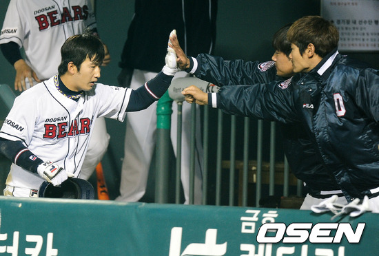 18일 오후 서울 잠실구장에서 열린 '2012 팔도 프로야구' 두산 베어스와 삼성 라이온즈의 경기, 4회말 공격을 마치고 선제 적시타를 날린 두산 최재훈이 더그아웃에서 동료선수들과 하이파이브를 하고 있다.