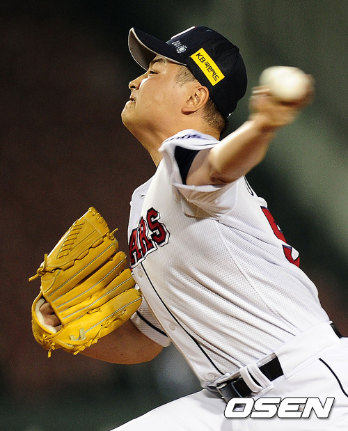 18일 오후 서울 잠실구장에서 열린 '2012 팔도 프로야구' 두산 베어스와 삼성 라이온즈의 경기, 8회초 마운드에 오른 두산 이혜천이 역투하고 있다.