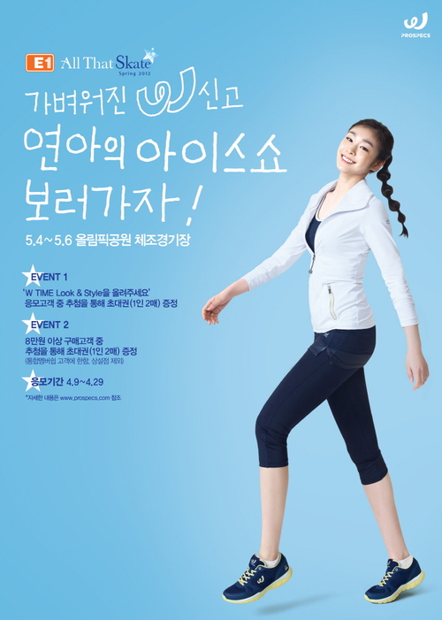 ‘연아와 수현의 가볍고 싶을땐, W TIME’ 캠페인이 한창인 프로스펙스는 매장과 홈페이지에서 동시에 김연아의 아이스쇼 초대 이벤트를 실시하는데 매장에서 상품을 구입하거나 코디 스타일로 응모하면 추첨 후보가 될 수 있다.