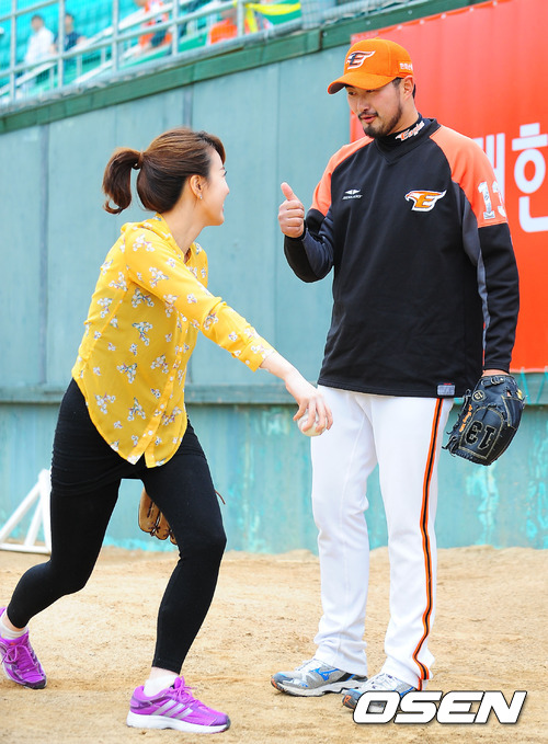19일 오후 충청북도 청주구장에서 '2012 팔도 프로야구' 한화 이글스와 LG 트윈스의 경기가 열릴 예정인 가운데 양팀 훈련시간에 한화 안승민이 오는 21일 시구가 예정되 있는 KBS 정지원 아나운서에게 투구폼을 교육하고 있다.