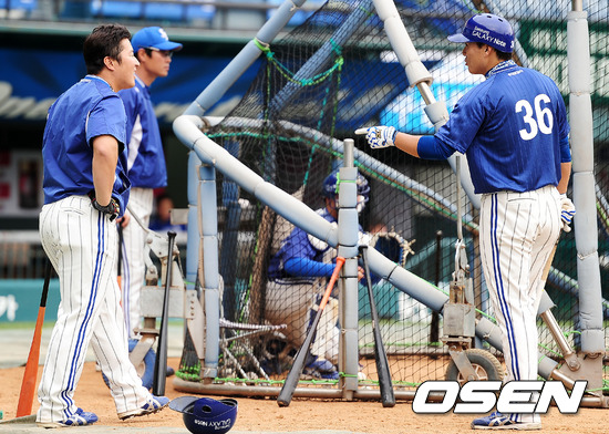 19일 오후 서울 잠실구장에서 열린 '2012 팔도 프로야구' 두산 베어스와 삼성 라이온즈의 경기에 앞서 삼성 최형우가 이승엽에 타격 조언을 듣고 있다.