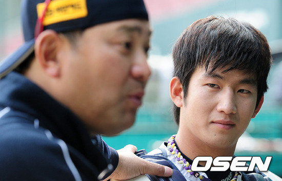 19일 오후 서울 잠실구장에서 열린 '2012 팔도 프로야구' 두산 베어스와 삼성 라이온즈의 경기에 앞서 두산 최재훈이 이토 코치의 지도를 받고 있다.
