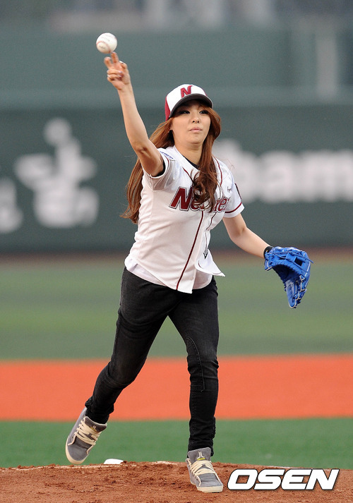 19일 오후 서울 목동야구장에서 열린 '2012 팔도 프로야구' 넥센 히어로즈와 KIA 타이거즈의 경기, 경기 전 가수 에일리가 시구를 하고 있다.