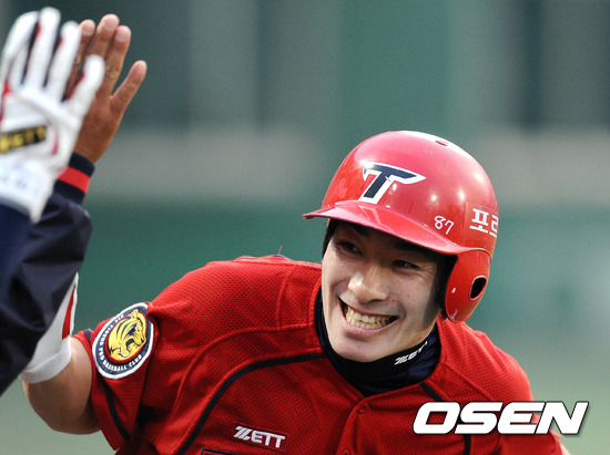 19일 오후 서울 목동야구장에서 열린 '2012 팔도 프로야구' 넥센 히어로즈와 KIA 타이거즈의 경기, 3회초 무사에서 홍재호가 선제 중월 솔로 홈런을 날리고 더그아웃에서 동료들과 하이파이브를 하고 있다.