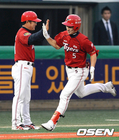 19일 오후 서울 목동야구장에서 열린 '2012 팔도 프로야구' 넥센 히어로즈와 KIA 타이거즈의 경기, 3회초 무사에서 홍재호가 선제 중월 솔로 홈런을 날리고 백인호 코치와 하이파이브를 하고 있다.