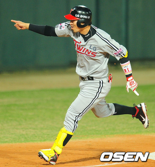 19일 오후 충청북도 청주구장에서 열린 '2012 팔도 프로야구' 한화 이글스와 LG 트윈스의 경기에서 9회초 첫타석에서 LG 정성훈이 우중월 홈런을 날린 후 그라운드를 돌고 있다.