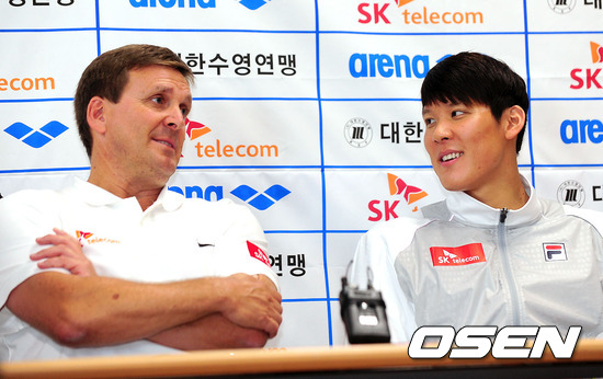 박태환과 마이클 볼 코치가 인터뷰 중 이야기를 나누고 있다 / soul1014@osen.co.kr
