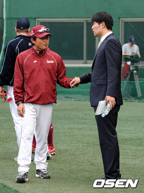 20일 오후 서울 목동야구장에서 열린 '2012 팔도 프로야구' 넥센 히어로즈와 두산 베어스의 경기에 앞서 이숭용 해설위원이 넥센 박흥식 코치와 이야기를 나누고 있다.