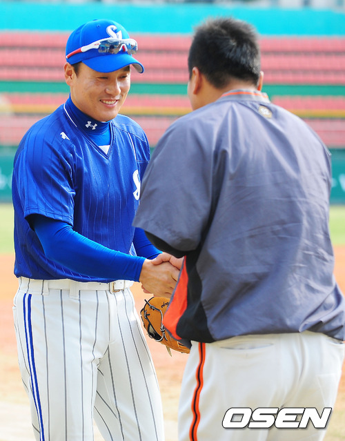 20일 오후 충청북도 청주구장에서 '2012 팔도 프로야구' 한화 이글스와 삼성 라이온즈의 경기가 열릴 예정인 가운데 경기 전 훈련시간에 삼성 이승엽과 김태균이 악수를 나누고 있다.