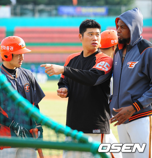 20일 오후 충청북도 청주구장에서 '2012 팔도 프로야구' 한화 이글스와 삼성 라이온즈의 경기가 열릴 예정인 가운데 경기 전 훈련시간에 한화 바티스타와 최진행이 얘기를 나누고 있다.