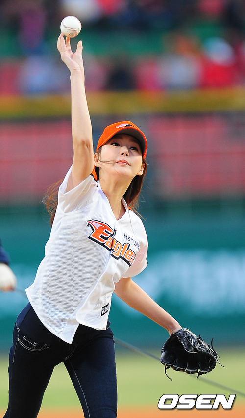 20일 오후 충청북도 청주구장에서 열린 '2012 팔도 프로야구' 한화 이글스와 삼성 라이온즈의 경기에서 미스코리아 출신(99년 미스코리아 진) 탤런트 김연주가 시구를 하고 있다.