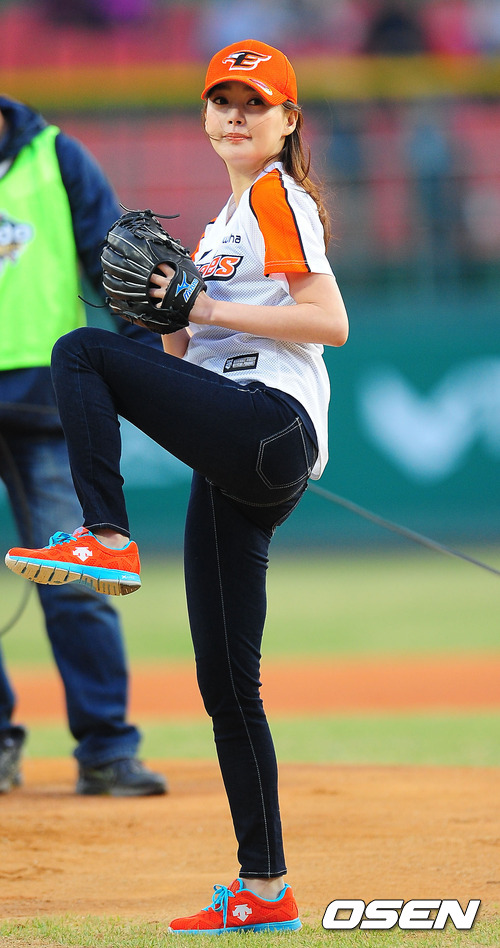 20일 오후 충청북도 청주구장에서 열린 '2012 팔도 프로야구' 한화 이글스와 삼성 라이온즈의 경기에서 미스코리아 출신(99년 미스코리아 진) 탤런트 김연주가 시구를 하고 있다.