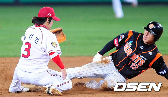 20일 오후 광주 무등야구장에서 열린 '2012 팔도 프로야구' KIA 타이거즈와 롯데 자이언츠의 경기 4회초 1사 1루 조성환의 타석, 1루주자 김주찬이 도루를 시도하는 가운데, 공이 빠지고 있다. 김주찬은 3루까지 진루.