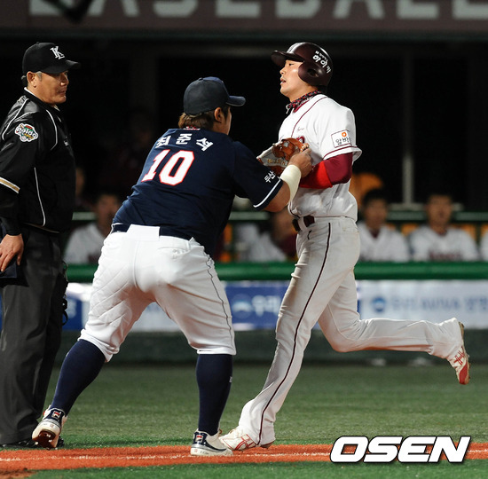 20일 오후 서울 목동야구장에서 열린 '2012 팔도 프로야구' 넥센 히어로즈와 두산 베어스의 경기, 6회말 2사 1,3루 넥센 정수성 타석때 도루를 시도한 3루주자 김민우가 협살에 걸려 두산 최준석에게 태그 아웃 되고 있다.