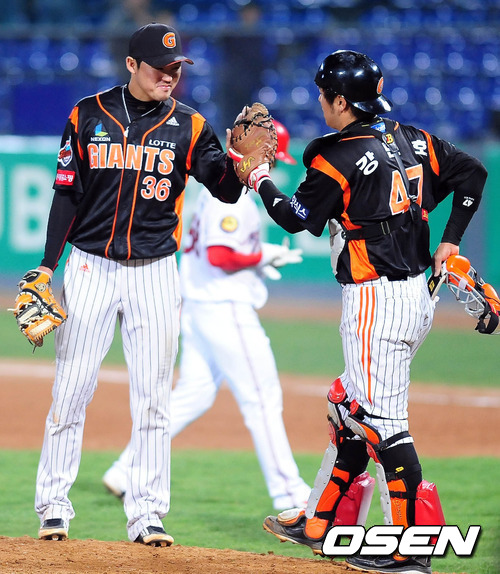 20일 오후 광주 무등야구장에서 열린 '2012 팔도 프로야구' KIA 타이거즈와 롯데 자이언츠의 경기 종료후 박종윤과 강민호가 하이파이브를 하고 있다.